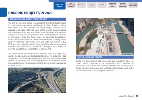 ORDU RING ROAD SUPPLY WORKS PROJECT The 21.4 km long 2x2 divided road project of Ordu Ring Road includes 6 double tube tunnels with a total length of 9.5 km, 7 viaducts with a total length of 3.7 km, 5 bridges and 7 interchanges. The productions required to be made within the scope of the contract were completed and provisional acceptance was issued as of December 2017 and final acceptance was issued as of December 2018. Due to landslides occurring on the route of Ordu Ring Road project, the Landslide Rehabilitation Works, which were opened to tender due to landslides occurring on the route of Ordu Ring Road project, were put under our contract in July 2016, and the productions within the scope of the relevant scope were completed and provisional acceptance was arranged as of October 2017 and final acceptance was arranged as of October 2018.The tender for the remaining works of the Ordu Ring Road project was won by the partnership led by Nurol Construction. The Ordu Ring Road Supply Works Contract was signed in July 2017 and construction works continue in accordance with the work programme. The 10.7 km section of the project between Per%u015fembe Junction and Otogar Junction was opened to traffic in 2019.SILIFKE-MUT ROAD PROJECTSilifke-Mut Road Project has been under our contract in 2017. The project, which is planned to be completed in 2025, includes the construction of 14.2 km long 2x2 road including the 2nd K%u0131l%u0131%u00e7 Arslan Bridge with inclined suspension and balanced cantilever deck and 3 NATM tunnels with a total length of 6,860 m.About The Report18ONGOING PROJECTS IN 2023Our Sustainability ApproachAbout The ReportUn Global Compact Content IndexApplicable Gri Sector StandardGovernanceSocialPerformance Indicators DetailsEcosystemSupplementary Works Of Ordu Ring Road ProjectSilifke-Mut Road Project