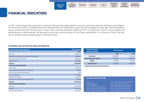 I. Direct Economic Impact Generated (TRY Thousand)2023Net Sales14,482,700Dividends from investments revalued through equity11,461,825Income from investing activities5,094,559Financial Return4,315,405Revenues35,354,489II. Economic Value DistributedCost of Sales11,559,213Salaries and benefits provided to employees1,236,910Social investment activities expense1,796Financial expenses12,517,263Net Monetary Position3,073,585Tax expenses (Payments to the government)640,679Expenses29,029,446III. Economic Value ProvidedRevenues35,354,489Expenses29,029,446Economic Value Provided6,325,043ECONOMIC VALUE CREATED AND DISTRIBUTED Nurol - YDA - Ozka Business PartnershipNurol - Mesa Business PartnershipNurol - G%u00fclermak Business PartnershipNurol - G%u00fclsan Business PartnershipGama - Nurol Business PartnershipNurol - G%u00fclermak - Makyol %u0130%u015f Ortakl%u0131%u011f%u0131Branches and PartnershipsNurol L.L.C.Nurol Georgia L.L.C.Nurol Georgia BranchNurol Construction Algeria BranchNurol Construction Romania Branch%u00d6zg%u00fcn - Nurol Business PartnershipFinancial Indicators (IFRS-Consolidated)(TRY Thousand)20222023Total Assets47,689,48951,947,912Total Stakeholders%u2019 Equity18,412,35623,966,938EBITDA1,394,9811,836,719Sales Revenues14,837,14414,482,700* Inflation-accounted values for 2022-2023In 2023, Nurol Construction continued to maintain its growth and stable financial structure, and its key financial indicators are as follows. As of the end of 2023, consolidated assets increased by 8% and shareholders%u2018 equity by 23% compared to a year ago, with shareholders%u2019 equity constituting 54% of total assets. Group%u2019s sales revenues decreased slightly by 2% to TL 14,482,700 in 2023. In 2023, despite the partial decline in sales revenues, the decrease in costs had a positive impact on the Group%u2019s profitability. As of the end of 2023, the total size of completed and ongoing projects is USD 30.6 billion.About The Report20FINANCIAL INDICATORSOur Sustainability ApproachAbout The ReportUn Global Compact Content IndexApplicable Gri Sector StandardGovernanceSocialPerformance Indicators DetailsEcosystem
