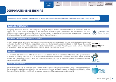 GLOBAL COMPACT T%u00dcRKIYEBy signing the United Nations Global Compact in August 2017, we made a commitment to act in accordance with and support the 10 basic universal principles of the convention on human rights, labour standards, environment and anticorruption. In 2023, we actively participated in the Global Compact Turkey Diversity and Inclusion working group, Sustainable Development Goals Target Program and Human Rights Training Program.WOMEN%u2019S EMPOWERMENT PRINCIPLES (WEPS)In 2020, we signed the %u2018Women%u2019s Empowerment Principles (WEPs)%u2019 published by UN Women, which includes commitments on %u2018Gender Equality%u2019 and %u2018Reducing Inequalities%u2019 among the Sustainable Development Goals. In 2023, %u2018Equal Opportunity Model%u2019 studies, which have similar approaches with the Women%u2019s Empowerment Principles, were carried out, and the details of the studies carried out are presented in detail in the %u2018Social%u2019 section of the report. 30% CLUBThe 30% Club is a collaboration in the business world where Board Chairmen and CEOs aim to improve the gender balance at all levels of their organisations. In 2020, with the 30% Club, which we joined with the representation of our CEO Nurettin Akdeniz, we continued our contact with the issues of increasing the ratio of female employees in Nurol Construction management levels in 2023WORLD WATER COUNCIL We are a member of the World Water Council, which works to ensure the global sustainability of critical living resources for the conservation, development, planning and management of water availability, water level utilisation, including taking the most effective decisions at all levels to promote awareness of fair water use around the world.Information on our corporate memberships as Nurol Construction and our recognition in external structures is given below. About The Report21CORPORATE MEMBERSHIPSOur Sustainability ApproachAbout The ReportUn Global Compact Content IndexApplicable Gri Sector StandardGovernanceSocialPerformance Indicators DetailsEcosystem