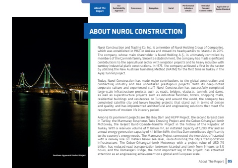 Nurol Construction and Trading Co. Inc. is a member of Nurol Holding Group of Companies, which was established in 1966 in Ankara and moved its headquarters to Istanbul in 2015. The company, whose main shareholder is Nurol Holding A.%u015e., is ultimately controlled by members of the %u00c7arm%u0131kl%u0131 family. Since its establishment, the company has made significant contributions to the agricultural sector with irrigation projects and to heavy industry with turnkey industrial plant constructions. In 1976, the company achieved a first in the sector by utilizing the New Austrian Tunneling Method (NATM) for the first time in Turkey in the Aya%u015f Tunnel project.Today, Nurol Construction has made major contributions to the global construction and contracting industry and has undertaken prestigious projects. With its deep-rooted corporate culture and experienced staff, Nurol Construction has successfully completed large-scale infrastructure projects such as roads, bridges, viaducts, tunnels and dams, as well as superstructure projects such as industrial facilities, hotels, shopping malls, residential buildings and residences. In Turkey and around the world, the company has completed satellite city and luxury housing projects that stand out in terms of design and quality, and has implemented architectural and engineering solutions that meet the requirements of modern life in every period.Among its prominent projects are the Il%u0131su Dam and HEPP Project, the second largest dam in Turkey, the Marmaray Bosphorus Tube Crossing Project and the Gebze-Orhangazi-Izmir Motorway, the largest Build-Operate-Transfer Project in the history of the Republic of Turkey. With a reservoir volume of 11 billion m%u00b3, an installed capacity of 1,200 MW and an annual energy generation capacity of 4.1 billion kWh, the Ilisu Dam contributes significantly to the country%u2019s energy needs. The Marmaray Project connected the two sides of Istanbul with a railway line 60 meters below sea level, revolutionizing the city%u2019s transportation infrastructure. The Gebze-Orhangazi-Izmir Motorway, with a project value of USD 7.5 billion, has reduced road transportation between Istanbul and Izmir from 9 hours to 3.5 hours, and the Osmangazi Bridge, the most important leg of the project, has attracted attention as an engineering achievement on a global and European scale.About The Report05G%u00fcney Yakla%u015f%u0131m Viyad%u00fc%u011f%u00fc ProjesiABOUT NUROL CONSTRUCTIONOur Sustainability ApproachAbout The ReportUn Global Compact Content IndexApplicable Gri Sector StandardGovernanceSocialPerformance Indicators DetailsEcosystemSouthern Approach Viaduct Project