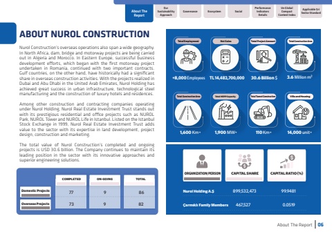 Nurol Holding A.%u015e899,532,47399.9481%u00c7arm%u0131kl%u0131 Family Members467,5270.0519ORGANIZATION/PERSONCAPITAL SHARECAPITAL RATIO (%)Net SalesTotal Project AmountTotal Construction AreaTotal EmploymentNurol Holding A.%u015e899,532,47399.9481%u00c7arm%u0131kl%u0131 Family Members467,5270.0519ORGANIZATION/PERSONCAPITAL SHARECAPITAL RATIO (%)Domestic Projects779Overseas Projects7398682COMPLETEDON-GOINGTOTALNet SalesTotal Project AmountTotal Construction AreaTotal Construction AreaTotal HEPP CapacityTotal Tunnel ConstructionVilla and HousingTotal Employment+8,000 EmployeesTL 14,482,700,000 30.6 Billion $3.6Million m%u00b21,600 Km+1,900 MW+110 Km+14,000 unit+Nurol Holding A.%u015e899,532,47399.9481%u00c7arm%u0131kl%u0131 Family Members467,5270.0519Domestic Projects779Overseas Projects7398682COMPLETEDON-GOINGTOTALNet SalesTotal Project AmountTotal Construction AreaTotal Construction AreaTotal HEPP CapacityTotal Tunnel ConstructionVilla and HousingTotal Employment+8,000 EmployeesTL 14,482,700,000 30.6 Billion $3.6Million m%u00b21,600 Km+1,900 MW+110 Km+14,000 unit+ABOUT NUROL CONSTRUCTIONNurol Construction%u2019s overseas operations also span a wide geography. In North Africa, dam, bridge and motorway projects are being carried out in Algeria and Morocco. In Eastern Europe, successful business development efforts, which began with the first motorway project undertaken in Romania, continued with two important contracts. Gulf countries, on the other hand, have historically had a significant share in overseas construction activities. With the projects realized in Dubai and Abu Dhabi in the United Arab Emirates, Nurol Holding has achieved great success in urban infrastructure, technological steel manufacturing and the construction of luxury hotels and residences.Among other construction and contracting companies operating under Nurol Holding, Nurol Real Estate Investment Trust stands out with its prestigious residential and office projects such as NUROL Park, NUROL Tower and NUROL Life in Istanbul. Listed on the Istanbul Stock Exchange in 1999, Nurol Real Estate Investment Trust adds value to the sector with its expertise in land development, project design, construction and marketing.The total value of Nurol Construction%u2019s completed and ongoing projects is USD 30.6 billion. The Company continues to maintain its leading position in the sector with its innovative approaches and superior engineering solutions.About The Report06Our Sustainability ApproachAbout The ReportUn Global Compact Content IndexApplicable Gri Sector StandardGovernanceSocialPerformance Indicators DetailsEcosystem