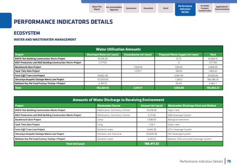 ECOSYSTEMWATER AND WASTEWATER MANAGEMENTPerformance Indicators Details78About The ReportUn Global Compact Content IndexApplicable Gri Sector StandardGovernanceEcosystemSocialOur Sustainability ApproachPerformance Indicators DetailsPERFORMANCE INDICATORS DETAILSWater Utilisation AmountsProjectMunicipal Water (m3/year)Groundwater (m3/year)Prepared Water Supply (m3/year)Total B1070 Test Building Construction Works Project10,018.00-51.7510,069.75B557 Production and R&D Building Construction Works Project5,177.0005,177.00Boukhroufa Dam Project1,928.00530.002,458.00Souk Tleta Dam Project-1,219.17183.451,402.62%u0130zmir %u00c7i%u011fli Tram Line Project24,662.00%u00a0-4,941.0029,603.00%u00dcmraniye Ata%u015fehir G%u00f6ztepe Metro Line Project157,029.001,259.2158,288.25Balikesir Dry Pet Food Factory T%u00fcrkiye-1 Project6,397.2565.456,462.7Total 183,264.153,147.177,030.89193,442.21Amounts of Water Discharge to Receiving EnvironmentProjectWastewater SourceAmount (m3/year)Wastewater Discharge Point and MethodB1070 Test Building Construction Works ProjectMobilisation, Dormitory, Kitchen10,018.00Septic tankB557 Production and R&D Building Construction Works ProjectMobilisation, Dormitory, Kitchen5,177.00ABB Sewerage System Boukhroufa Dam ProjectCamp 1,928.00Biological treatmentSouk Tleta Dam ProjectCamp 1,219.2Septic tank%u0130zmir %u00c7i%u011fli Tram Line ProjectDomestic water4,642.90IZSU Sewerage System%u00dcmraniye Ata%u015fehir G%u00f6ztepe Metro Line ProjectDomestic and industrial157,029.00ISKI Sewerage SystemBalikesir Dry Pet Food Factory T%u00fcrkiye-1 ProjectDomestic water6,397.25Bal%u0131kesir OSB connected Sewerage SystemTotal (m3/year)186,411.32