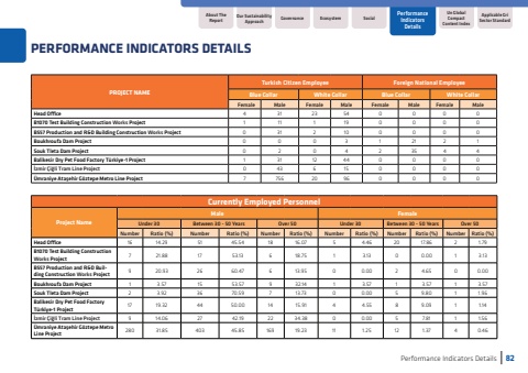 Performance Indicators Details82About The ReportUn Global Compact Content IndexApplicable Gri Sector StandardGovernanceEcosystemSocialOur Sustainability ApproachPerformance Indicators DetailsPERFORMANCE INDICATORS DETAILSPROJECT NAMETurkish Citizen EmployeeForeign National Employee Blue CollarWhite CollarBlue CollarWhite CollarFemaleMaleFemaleMaleFemaleMaleFemaleMaleHead Office43123540000B1070 Test Building Construction Works Project1111190000B557 Production and R&D Building Construction Works Project0312100000Boukhroufa Dam Project000312121Souk Tleta Dam Project020423544Balikesir Dry Pet Food Factory T%u00fcrkiye-1 Project13112440000%u0130zmir %u00c7i%u011fli Tram Line Project0436150000%u00dcmraniye Ata%u015fehir G%u00f6ztepe Metro Line Project775620960000Currently Employed PersonnelProject NameMaleFemaleUnder 30Between 30 - 50 YearsOver 50Under 30Between 30 - 50 YearsOver 50NumberRatio (%)NumberRatio (%)NumberRatio (%)NumberRatio (%)NumberRatio (%)NumberRatio (%)Head Office1614.29 5145.54 1816.07 54.46 2017.86 21.79 B1070 Test Building Construction Works Project721.88 1753.13 618.75 13.13 00.00 13.13 B557 Production and R&D Building Construction Works Project920.93 2660.47 613.95 00.00 24.65 00.00 Boukhroufa Dam Project13.57 1553.57 932.14 13.57 13.57 13.57 Souk Tleta Dam Project23.92 3670.59 713.73 00.00 59.80 11.96 Balikesir Dry Pet Food Factory T%u00fcrkiye-1 Project1719.32 4450.00 1415.91 44.5589.09 11.14 %u0130zmir %u00c7i%u011fli Tram Line Project914.06 2742.19 2234.38 00.00 57.81 11.56 %u00dcmraniye Ata%u015fehir G%u00f6ztepe Metro Line Project28031.85 40345.85 16919.23 111.25 121.37 40.46