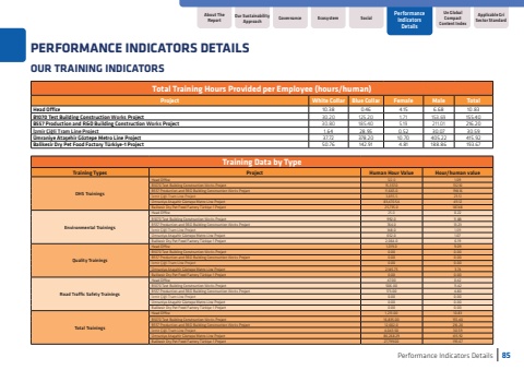 Performance Indicators Details85OUR TRAINING INDICATORSAbout The ReportUn Global Compact Content IndexApplicable Gri Sector StandardGovernanceEcosystemSocialOur Sustainability ApproachPerformance Indicators DetailsPERFORMANCE INDICATORS DETAILSTotal Training Hours Provided per Employee (hours/human)ProjectWhite CollarBlue CollarFemaleMaleTotalHead Office10.380.464.156.6810.83B1070 Test Building Construction Works Project30.20125.201.71153.69155.40B557 Production and R&D Building Construction Works Project30.80185.405.19211.01216.20%u0130zmir %u00c7i%u011fli Tram Line Project1.6428.950.5230.0730.59%u00dcmraniye Ata%u015fehir G%u00f6ztepe Metro Line Project37.72378.2010.70405.22415.92Balikesir Dry Pet Food Factory T%u00fcrkiye-1 Project50.76142.914.81188.86193.67Training Data by TypeTraining TypesProjectHuman Hour ValueHour/human valueOHS Trainings Head Office122.01.09B1070 Test Building Construction Works Project15,337.0132.10B557 Production and R&D Building Construction Works Project11,665.0198.16%u0130zmir %u00c7i%u011fli Tram Line Project3,895.529.51%u00dcmraniye Ata%u015fehir G%u00f6ztepe Metro Line Project83,470.54411.12Balikesir Dry Pet Food Factory T%u00fcrkiye-1 Project25,735.0187.48Environmental Trainings Head Office25.00.22B1070 Test Building Construction Works Project992.011.88B557 Production and R&D Building Construction Works Project764.013.23%u0130zmir %u00c7i%u011fli Tram Line Project148.01.09%u00dcmraniye Ata%u015fehir G%u00f6ztepe Metro Line Project652.01.07Balikesir Dry Pet Food Factory T%u00fcrkiye-1 Project2,064.06.19Quality Trainings Head Office1,019.09.09B1070 Test Building Construction Works Project0.000.00B557 Production and R&D Building Construction Works Project0.000.00%u0130zmir %u00c7i%u011fli Tram Line Project0.000.00%u00dcmraniye Ata%u015fehir G%u00f6ztepe Metro Line Project2,145.753.74Balikesir Dry Pet Food Factory T%u00fcrkiye-1 Project0.000.00Road Traffic Safety TrainingsHead Office47.000.42B1070 Test Building Construction Works Project506.0011.42B557 Production and R&D Building Construction Works Project173.004.80%u0130zmir %u00c7i%u011fli Tram Line Project0.000.00%u00dcmraniye Ata%u015fehir G%u00f6ztepe Metro Line Project0.000.00Balikesir Dry Pet Food Factory T%u00fcrkiye-1 Project0.000.00Total TrainingsHead Office1,213.0010.83B1070 Test Building Construction Works Project16,835.00155.40B557 Production and R&D Building Construction Works Project12,602.0216.20%u0130zmir %u00c7i%u011fli Tram Line Project4,043.5030.59%u00dcmraniye Ata%u015fehir G%u00f6ztepe Metro Line Project86,268.29415.92Balikesir Dry Pet Food Factory T%u00fcrkiye-1 Project27,799.00193.67