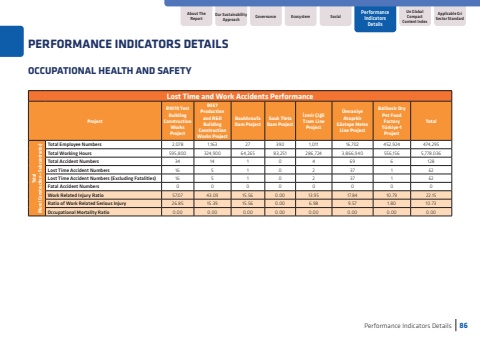 Performance Indicators Details86OCCUPATIONAL HEALTH AND SAFETYAbout The ReportUn Global Compact Content IndexApplicable Gri Sector StandardGovernanceEcosystemSocialOur Sustainability ApproachPerformance Indicators DetailsPERFORMANCE INDICATORS DETAILSLost Time and Work Accidents PerformanceProjectB1070 Test Building Construction Works ProjectB557 Production and R&D Building Construction Works ProjectBoukhroufa Dam ProjectSouk Tleta Dam Project%u0130zmir %u00c7i%u011fli Tram Line Project%u00dcmraniye Ata%u015fehir G%u00f6ztepe Metro Line ProjectBalikesir Dry Pet Food Factory T%u00fcrkiye-1 ProjectTotalTotal (Nurol Construction + Subcontractor)Total Employee Numbers2,0781,163273901,01116,702452,924474,295Total Working Hours 595,800324,90064,26583,251286,7243,866,940556,1565,778.036Total Accident Numbers 3414104696128Lost Time Accident Numbers16510237162Lost Time Accident Numbers (Excluding Fatalities) 16510237162Fatal Accident Numbers 00000000Work Related Injury Ratio 57.0743.0915.560.0013.9517.8410.7922.15Ratio of Work Related Serious Injury 26.8515.3915.560.006.989.571.8010.73Occupational Mortality Ratio0.000.000.000.000.000.000.000.00