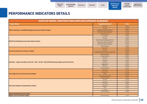 Performance Indicators Details88RATIO OF NUROL CONSTRUCTION SUPPLIER EXPENSES IN BUDGETProject NameSupplied MaterialOran\ Production and R&D Building Construction Works Project\Concrete5,05%Re-Bar3,62%Mechanical Works Material4,78%Electrical Works Material16,01%Other Material5,98%B1070 Test Building Construction Works ProjectConcrete2,45%Re-Bar1,84%Roof-Fa%u00e7ade Cladding Material0,38%Mechanical Works Material10,20%Electrical Works Material6,29%Other Material3,98%Dry Pet Food Factory T%u00fcrkiye-1 Project Concrete5,72%Re-Bar14,55%Prefabricated Structural Component0,18%Other Material4,69%Nusfalau - Suplacu de Barcau (km 66 + 500 - km 80 + 054.044) Motorway Design and ConstructionFilling Material10,40%Cement1,66%Concrete5,51%Re-Bar0,16%Aggregate2,83%Bitumen8,06%Other Material13,10%%u0130zmir %u00c7i%u011fli Tram Line Construction ProjectConcrete2,37%Steel Mesh0,02%Rail0,06%Fine Works Material13,25%Other Material3,71%%u00dcmraniye Ata%u015fehir G%u00f6ztepe Metro ProjectRe-Bar11,67%Concrete16,55%Shotcrete1,88%Segment1,43%Rail0,52%Insulation1,77%Other Material2,66%Algeria Boukhroufa Dam Project--Algeria Souk Tleta Dam Project Other Material0,21%About The ReportUn Global Compact Content IndexApplicable Gri Sector StandardGovernanceEcosystemSocialOur Sustainability ApproachPerformance Indicators DetailsPERFORMANCE INDICATORS DETAILS