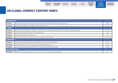 UN GLOBAL COMPACT CONTENT INDEXAbout The ReportUn Global Compact Content IndexApplicable Gri Sector StandardGovernanceSocialPerformance Indicators DetailsEcosystemOur Sustainability ApproachUn Global Compact Content Index89HUMAN RIGHTSPrinciple 1Businesses should support and respect the protection of internationally proclaimed human rights; and52-56Principle 2make sure that they are not complicit in human rights abuses.52-56LABOURPrinciple 3Businesses should uphold the freedom of association and the effective recognition of the right to collective bargaining;41, 52-56Principle 4elimination of all forms of forced and compulsory labor;56Principle 5the effective abolition of child labor; and56Principle 6the elimination of discrimination in respect of employment and occupation.52-54, 62-64ENVIROMENTPrinciple 7Businesses should support a precautionary approach to environmental challenges.44-50Principle 8undertake initiatives to promote greater environmental responsibility; and44-50Principle 9encourage the development and diffusion of environmentally friendly technologies.44-50ANTI-CORRUPTIONPrinciple 10Businesses should work against corruption in all its forms, including extortion and bribery.40