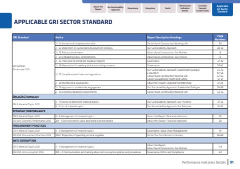 Performance Indicators Details91Un Global Compact Content IndexAbout The ReportApplicable Gri Sector StandardGovernanceSocialPerformance Indicators DetailsEcosystemOur Sustainability ApproachAPPLICABLE GRI SECTOR STANDARDGRI StandardNoticeReport Description HeadingsPage NumbersGRI General Disclosures 20212 - 21 Annual total compensation ratioSocial: Nurol Construction Working Life532 - 22 Statement on sustainable development strategyOur Sustainability Approach28-322 - 23 Policy commitmentsAbout Nurol Construction: Our Policies82 - 24 Embedding policy commitmentsAbout Nurol Construction: Our Policies82 - 25 Processes to remediate negative impactsGovernance 37-422 - 26 Mechanism for seeking advice and raising concernsGovernance37-422 - 27 Compliance with laws and regulationsOur Sustainability Approach: Stakeholder Dialogue EcosystemSocial: Nurol Construction Working LifeSocial: Occupational Health and Safety33-35, 44-50,52-56,57-612 - 28 Membership associationsAbout the Report: Corporate Memberships21-242 - 29 Approach to stakeholder engagementOur Sustainability Approach: Stakeholder Dialogue33-352 - 30 Collective bargaining agreementsSocial: Nurol Construction Working Life52-56%u00d6NCEL%u0130KL%u0130 KONULARGRI 3 Material Topics 20213 - 1 Process to determine material topicsOur Sustainability Approach: Our Priorities31-323 - 2 List of material topicsOur Sustainability Approach: Our Priorities31-32ECONOMIC PERFORMANCEGRI 3 Material Topics 20213 - 3 Management of material topicsAbout the Report: Financial Indicators20GRI 201: Economic Performance 2016201 - 1 Direct economic value generated and distributedAbout the Report: Financial Indicators20%u00a0PROCUREMENT PRACTICESGRI 3 Material Topics 20213 - 3 Management of material topicsGovernance: Value Chain Management41GRI 204: Procurement Practices 2016204-1 Proportion of spending on local suppliersSocial: Our Contribution to Society65-69ANTI-CORRUPTIONGRI 3 Material Topics 20213 - 3 Management of material topicsAbout the ReportAbout Nurol Construction: Our Policies3-8GRI 205: Anti-corruption 2016205 %u2013 2 Communication and training about anti-corruption policies and proceduresGovernance: Ethics and Compliance40