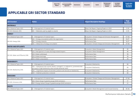 Performance Indicators Details92Un Global Compact Content IndexAbout The ReportApplicable Gri Sector StandardGovernanceSocialPerformance Indicators DetailsEcosystemOur Sustainability ApproachAPPLICABLE GRI SECTOR STANDARDGRI StandardNoticeReport Description HeadingsPage NumbersMATERIALSGRI 3 Material Topics 20213 - 3 Management of material topicsAbout the Report: Ongoing Projects in 202312-19GRI 301: Materials 2016301 %u2013 1 Materials used by weight or volumeAbout the Report: Ongoing Projects in 202312-19ENERGYGRI 3 Material Topics 20213 - 3 Management of material topicsEcosystem: Climate Change and Emission Management47-48GRI 302: Energy 2016302 - 1 Energy consumption within the organization Performance Data76-77302 - 3 Energy intensityPerformance Data76-77302 - 4 Reduction of energy consumptionEcosystem: Climate Change and Emissions Management47-48WATER AND EFFLUENTSGRI 3 Material Topics 20213 - 3 Management of material topicsEcosystem: Water Management49GRI 303: Water and Effluents 2018303-2 Management of water discharge related impactsEcosystem: Water Management49303-3 Water withdrawalPerformance Data78303-4 Water dischargePerformance Data78303-5 Water consumptionPerformance Data78BIODIVERSITYGRI 3 Material Topics 20213 - 3 Management of material topicsEcosystem: Biodiversity50GRI 304: Biodiversity 2016304 - 1 Operational sites owned, leased, managed in, or adjacent to, protected areas and areas of high biodiversity value outside protected areasEcosystem: Biodiversity50304 - 2 Significant impacts of activities, products and services on biodiversityEcosystem: Biodiversity50304 - 3 Habitats protected or restoredEcosystem: Biodiversity50EMISSIONSGRI 3 Material Topics 20213 - 3 Management of material topicsEcosystem: Climate Change and Emissions Management47-48GRI 305: Emissions 2016305-1 Direct (Scope 1) greenhouse gas (GHG) emissions Performance Data77305-2 Energy indirect (Scope 2) greenhouse gas (GHG) emissions Performance Data77WASTEGRI 3 Material Topics 20213 - 3 Management of material topicsEcosystem: Waste Management and Circular Economy45-46