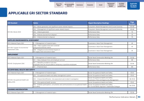 Performance Indicators Details93Un Global Compact Content IndexAbout The ReportApplicable Gri Sector StandardGovernanceSocialPerformance Indicators DetailsEcosystemOur Sustainability ApproachAPPLICABLE GRI SECTOR STANDARDGRI StandardNoticeReport Description HeadingsPage NumbersGRI 306: Waste 2020306 -1 Waste generation and significant waste-related impactsEcosystem: Waste Management and Circular Economy45-46306 - 2 Management of significant waste related impactsEcosystem: Waste Management and Circular Economy45-46306 - 3 Waste generatedPerformance Data75306 - 4 Waste diverted from disposalPerformance Data75306 - 5 Waste directed to disposalPerformance Data75SUPPLIER ENVIRONMENTAL ASSESSMENTGRI 3 Material Topics 20213 - 3 Management of material topicsGovernance: Value Chain Management41GRI 308: Supplier Environmental Assessment 2016 308 - 1 New suppliers that were screenedusing environmental criteriaGovernance: Value Chain Management41308 - 2 Negative environmental impacts inthe supply chain and actions takenGovernance: Value Chain Management41EMPLOYMENTGRI 3 Material Topics 20213 - 3 Management of material topicsSocial: Nurol Construction Working Life52-56GRI 401: Employment 2016401 - 1 New employee hires and employee turnoverPerformance Data83401 - 2 Benefits provided to full-timeemployees that are not provided to temporary or parttime employeesSocial: Nurol Construction Working Life52-54401 - 3 Parental leavePerformance Data84OCCUPATIONAL HEALTH AND SAFETYGRI 3 Material Topics 20213 - 3 Management of material topicsSocial: Occupational Health and Safety57-61GRI 403: Occupational Health and Safety 2018403 - 1 Occupational health and safety management system Social: Occupational Health and Safety57-61403 - 2 Hazard identification, risk assessment and incident investigation Social: Occupational Health and SafetyGovernance: Risk and Opportunity Management39, 57-61403 - 3 Occupational health servicesSocial: Occupational Health and Safety57-61403 - 4 Worker participation, consultation and communication on occupational health and safetySocial: Occupational Health and SafetyOur Sustainability Approach: Stakeholder Dialogue34, 57-61TRAINING AND EDUCATIONGRI 3 Material Topics 20213 - 3 Management of material topicsSocial: Nurol Construction Working Life55-56