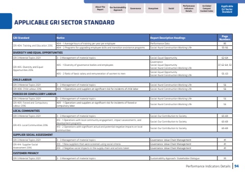 Performance Indicators Details94Un Global Compact Content IndexAbout The ReportApplicable Gri Sector StandardGovernanceSocialPerformance Indicators DetailsEcosystemOur Sustainability ApproachAPPLICABLE GRI SECTOR STANDARDGRI StandardNoticeReport Description HeadingsPage NumbersGRI 404: Training and Education 2016404 - 1 Average hours of training per year per employeePerformance Data85404 - 2 Programs for upgrading employee skills and transition assistance programsSocial: Nurol Construction Working Life55-56DIVERSITY AND EQUAL OPPORTUNITIESGRI 3 Material Topics 20213 - 3 Management of material topicsSocial: Equal Opportunity62-64GRI 405: Diversity and Equal Opportunities 2016405 - 1 Diversity of governance bodies and employeesGovernanceSocial: Equal OpportunitySocial: Nurol Construction Working Life37, 62-64, 53405 - 2 Ratio of basic salary and remuneration of women to menSocial: Equal Opportunity Social: Nurol Construction Working Life53, 63CHILD LABOURGRI 3 Material Topics 20213 - 3 Management of material topicsSocial: Nurol Construction Working Life56GRI 408: Child Labour 2016 408 %u2013 1 Operations and suppliers at significant risk for incidents of child laborSocial: Nurol Construction Working Life56FORCED OR COMPULSORY LABOURGRI 3 Material Topics 20213 - 3 Management of material topicsSocial: Nurol Construction Working Life56GRI 409: Forced and Compulsory Labour 2016409 %u2013 1 Operations and suppliers at significant risk for incidents of forced or compulsory laborSocial: Nurol Construction Working Life56LOCAL COMMUNITIESGRI 3 Material Topics 20213 - 3 Management of material topicsSocial: Our Contribution to Society65-69GRI 413: Local Communities 2016413 - 1 Operations with local community engagement, impact assessments, and development programsSocial: Our Contribution to Society65-69413 - 2 Operations with significant actual and potential negative impacts on local communitiesSocial: Our Contribution to Society65-69SUPPLIER SOCIAL ASSESSMENTGRI 3 Material Topics 20213 - 3 Management of material topicsGovernance: Value Chain Management41GRI 414: Supplier Social Assessment 2016414 - 1 New suppliers that were screened using social criteriaGovernance: Value Chain Management41414 - 2 Negative social impacts in the supply chain and actions takenGovernance: Value Chain Management41CUSTOMER PRIVACYGRI 3 Material Topics 20213 - 3 Management of material topicsSustainability Approach: Stakeholder Dialogue35