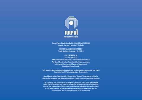 CONSTRUCTIONNurol Plaza, B%u00fcy%u00fckdere Caddesi No:255 Kat:19 34485Maslak - Sar%u0131yer / %u0130stanbul / TURKEYMERS%u0130S No: 0632004223900012Trade Registry: Istanbul %u2013 964991-0P: 0 212 286 80 10F: 0 212 286 80 11www.nurolinsaat.com.tr/en - info@nurolinsaat.com.trFor Nurol Construction Sustainability Report, contact:Integrated Management Systems Departmentinsaat.eys@nurol.com.trThis report is distributed digitally due to our environmental awareness, and it will be printed on 100% recycled paper if necessary.Nurol Construction Sustainability Report (the %u201cReport%u201d) is prepared solely for information purposes and does not constitute a basis for any investment decision. The contents and information included in this report have been prepared by using the information and sources believed to be accurate and reliable at the time of the preparation of the report, and the referred objectives and content in the report cannot be interpreted as any declaration, guarantee and/or commitment, and is not guaranteed to be immutable.